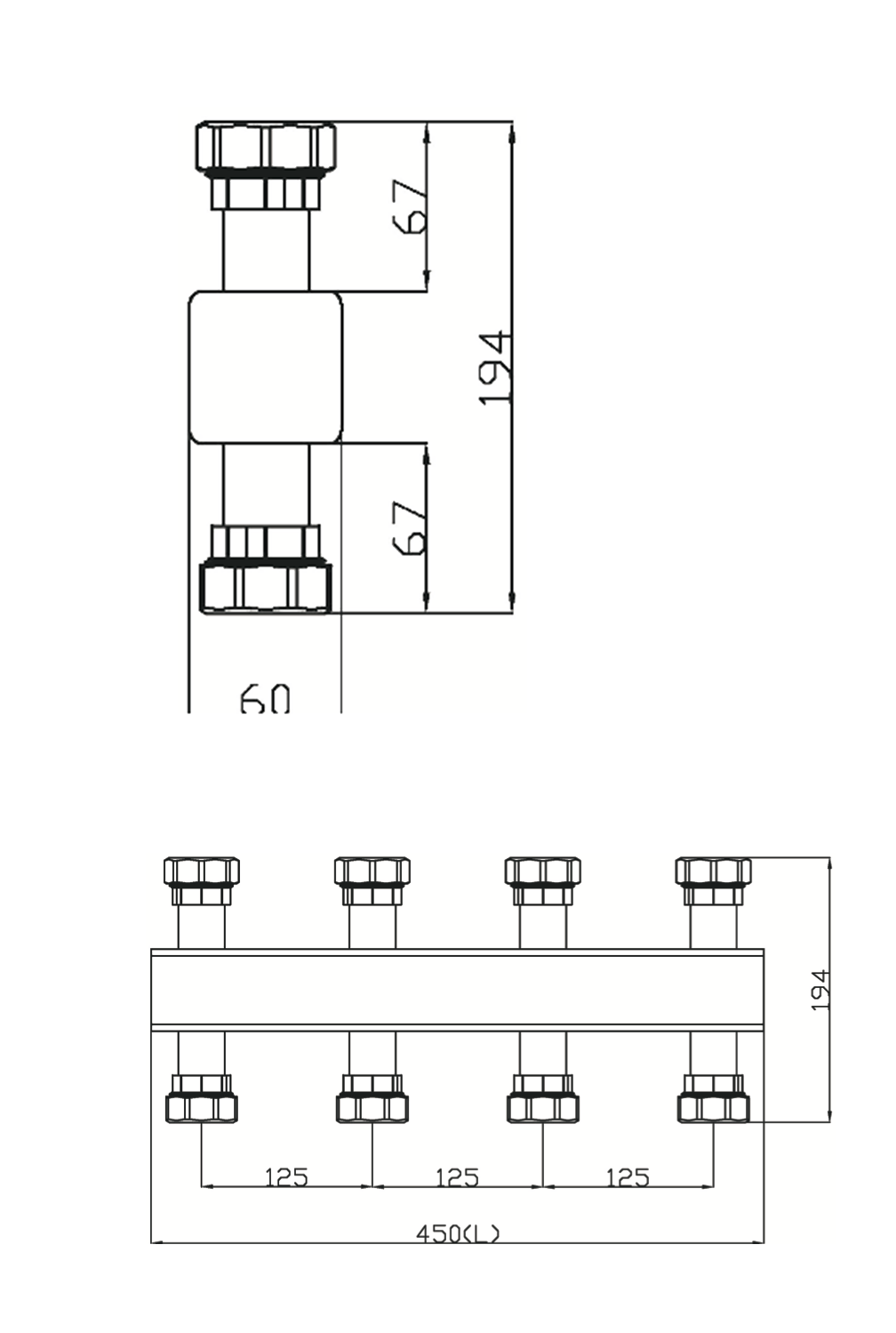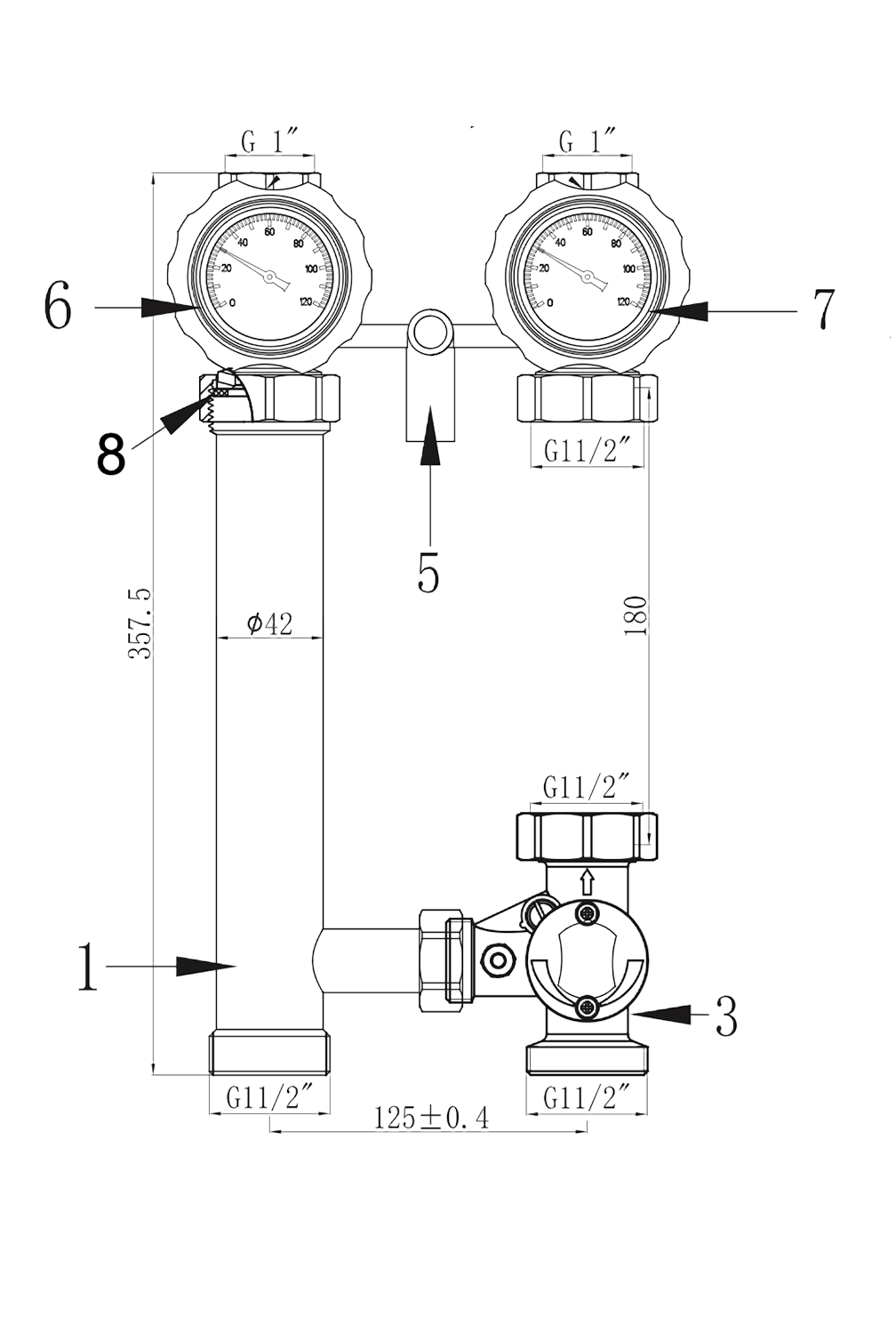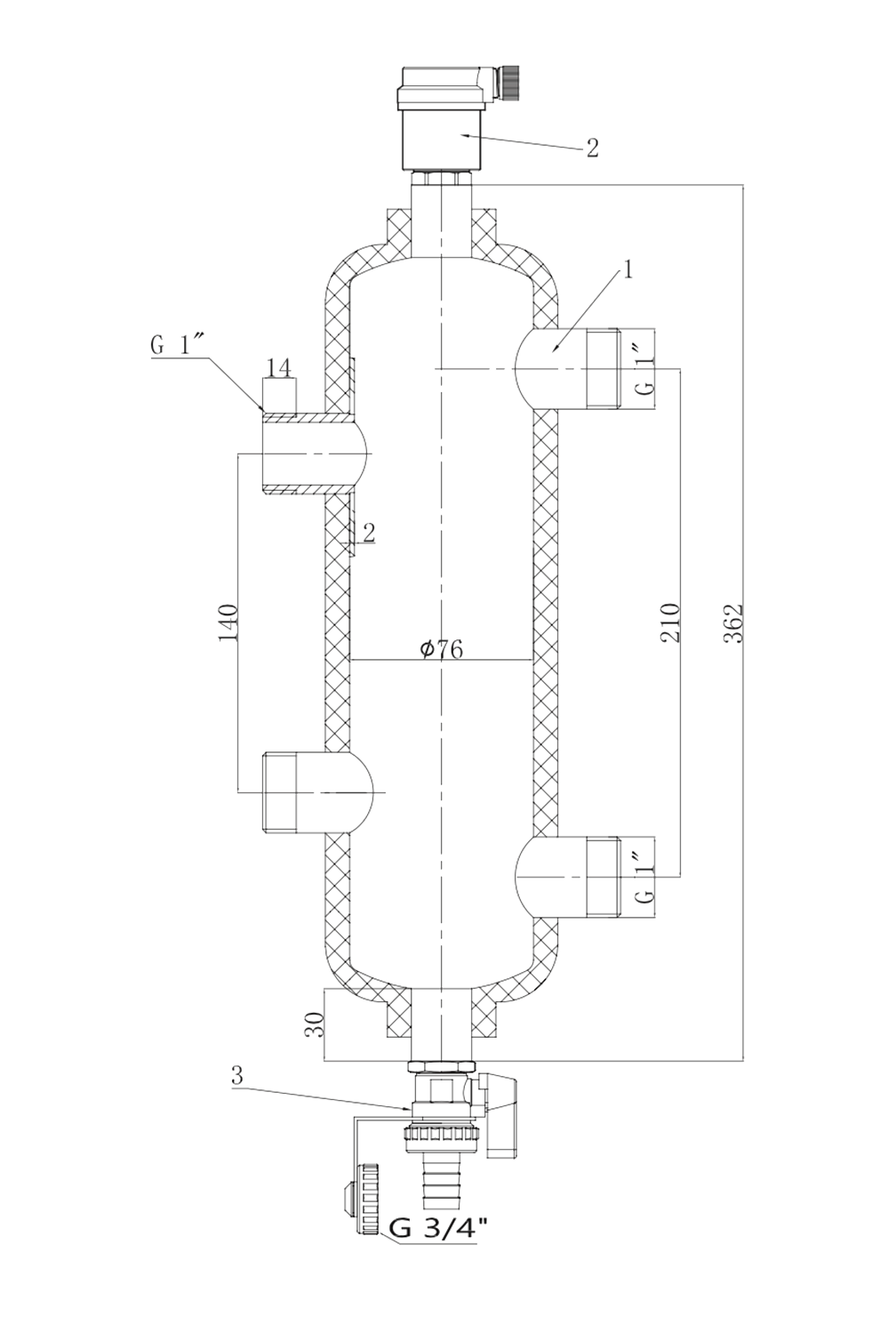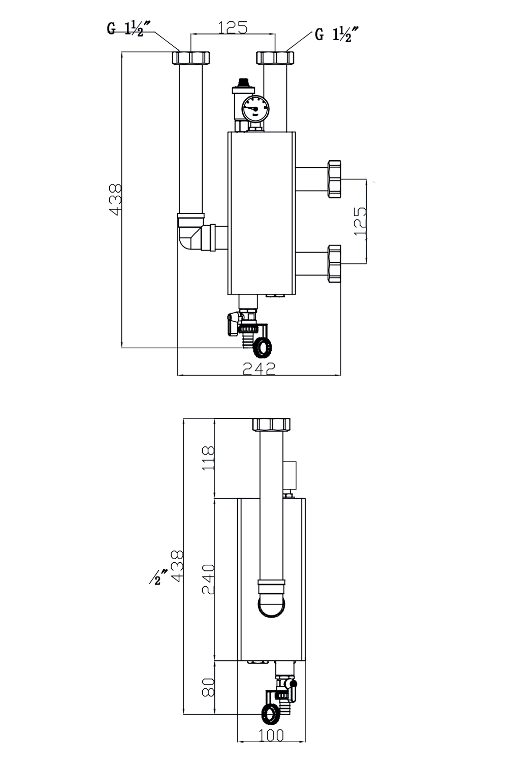 Гидравлическое разделение контуров, удаление воздуха и грязи. Подключение 1 1/2" НГ. Макс. давление 6 бар, макс. температура 100°С. Монтаж на коллектор, вертикально. |