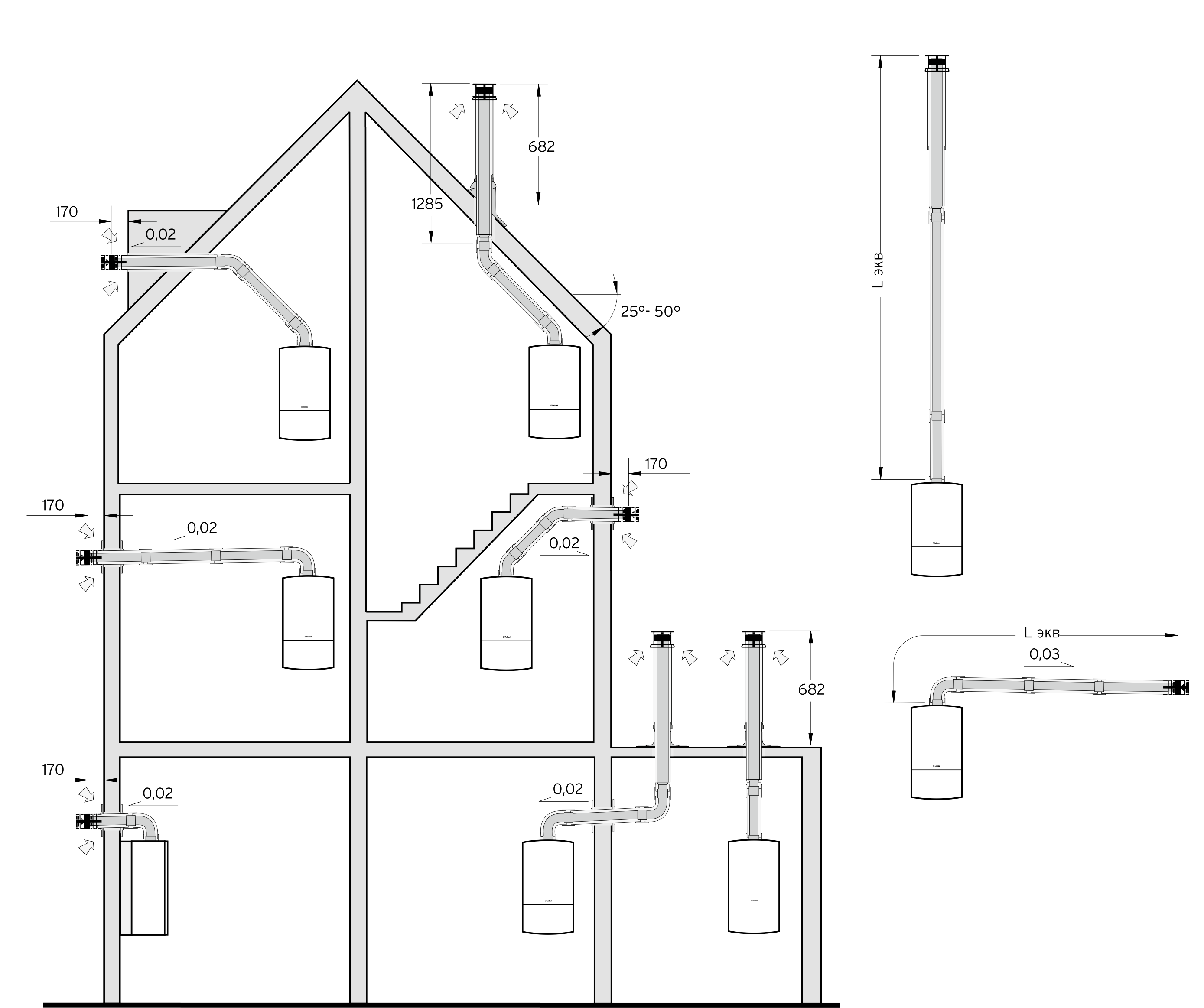 ВНИМАНИЕ: Дополнительные изменения направления системы дымохода/воздуховода уменьшают указанную максимальную эквивалентную длину труб Lэкв: