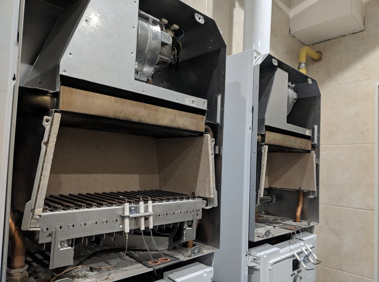 Проведено комплексное техническое обслуживание двух котлов. При работе с двумя котлами одновременно особое внимание уделяется синхронизации работы оборудования, равномерному распределению нагрузки, проверке соединительных контуров и настройке системы автоматического переключения.